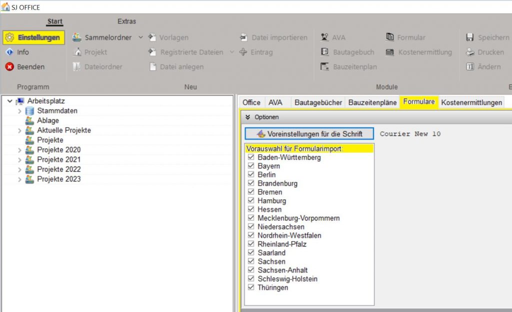 vorauswahl in den Programmeinstellungen für die Anzeige der gewünschten Bundesländer im Formularimport